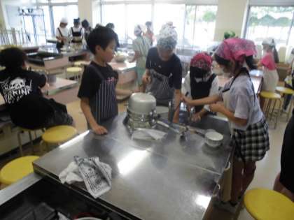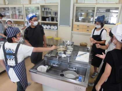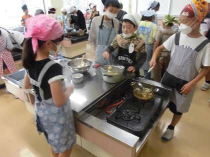 5年2組が、家庭科の調理実習で、ジャガイモとほうれん草を煮て、食べました。火の強さや野菜の柔らかさなどを調整して、班で協力しておいしくできました。