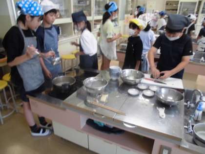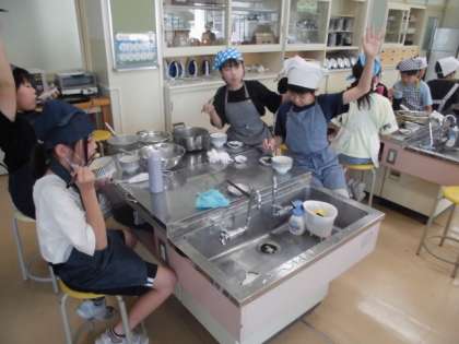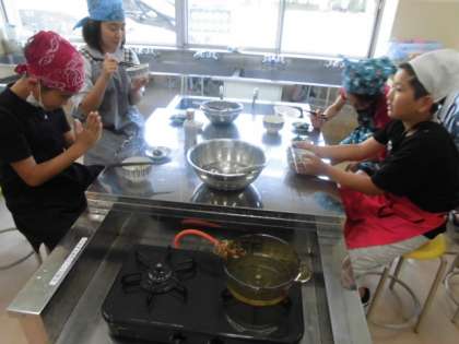 5年生が家庭科調理実習で、じゃがいもとほうれん草をゆでました。しょうゆ、かつお節、こしょうという少しの調味料でも、食材そのもののおいしさが感じられて、おいしく食べました。