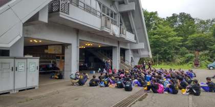 自然の家の下に降りてきて、不動棟の前で説明を聞きます。天候は雲り、何とか外で活動しています。