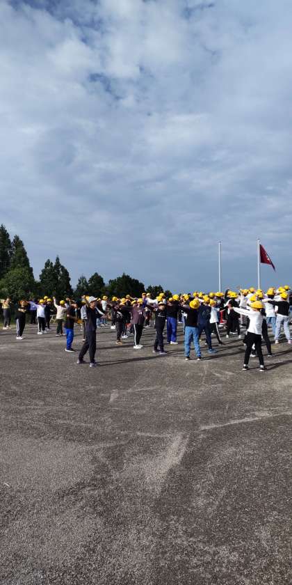 朝、起きて、清掃や荷物整理をして、立山広場で朝の集い、ラジオ体操です。昨夜はみんなよく寝て元気です。