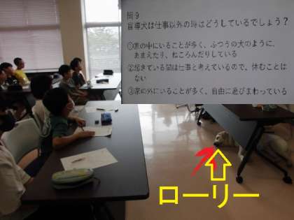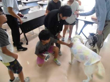 5年生が総合的な学習の時間に、県内に4頭しかいない盲導犬「ローリー」とそのユーザーの方に学校に来ていただき、目の不自由な方の生活や、自分たちにできることについて学びました。ローリーはとてもおとなしく、ユーザーの方の目になり、子供たちにもなついていました。