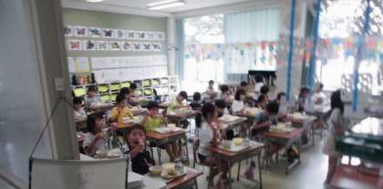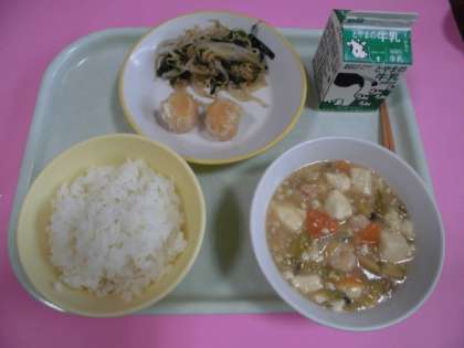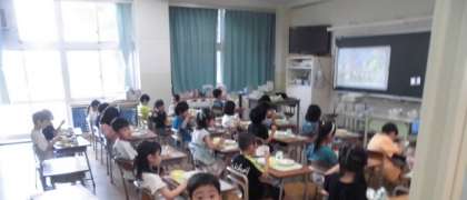 「ごはん、にんじんシューマイ、エビと豆腐のうま煮、ナムル」でした。上の画像は、おいしく食べる1年生の様子。明日は、夏野菜カレーライスです。