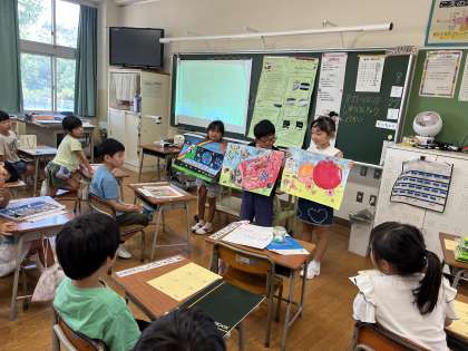 1年生にとって初めての2学期です。重い荷物を持って一生懸命に登校して来ました。朝顔の観察カードや絵日記からもそれぞれのお子さんが素敵な夏休みを過ごしたことが伝わってきました。課題へのご協力、ありがとうございました。写真は、夏休みの自由研究や作品を紹介している様子です。