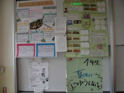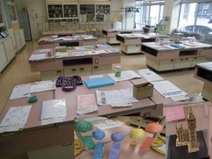 4年生ともなれば、「○○の研究」とか、色や材料・作り方を工夫した図工作品などが多数みられます。家庭科室に集めて展示してあります。