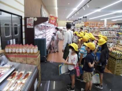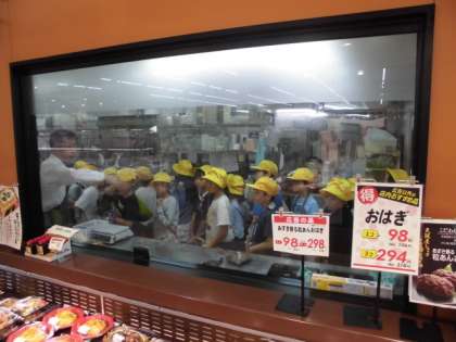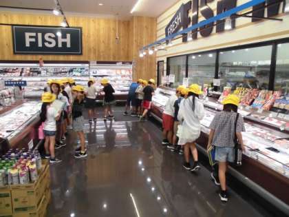 3年生が、社会科で、近隣のスーパーマーケットの見学に行きました。売り場だけでなく、裏側のバックヤードなども見せていただいて、説明を聞きました。