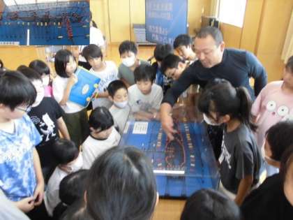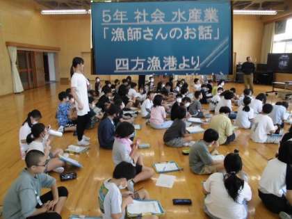 四方漁港の漁師さんに学校へ来ていただき、5年生が、漁業について話を聞いたり、定置網の模型を見せてもらったりしました。「定置網の長さは900mもあるんだって」「シイラなど昔はとれなかった魚が最近とれるそうだよ」街の子、山びこっ子が、海や魚について学んでいます。