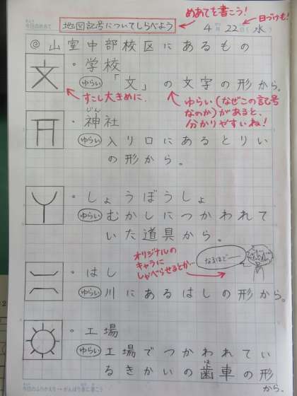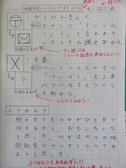 たとえば、下の例にあるような、ひたすら地図記号についてしらべてまとめていくやり方。