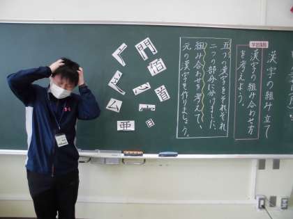 今日は、漢字クイズを出します。先生が、5つの漢字をそれぞれ2つに分けて、バラバラにしてしまいました。みんなは、元の漢字にもどすことができるかな??