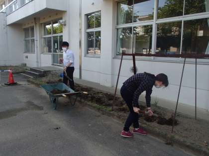 ヘチマが元気に育つように、花壇の整備をしました。休校が明けたら、生長の様子を一緒に観察しましょうね。