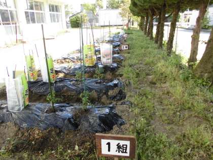 みなさんのはたけに、クラスごとのふだが立てられました。ようむいんさんにおねがいしたら、とてもりっぱなふだにしてくださいました。学校にきたときには、おれいを言いましょうね。