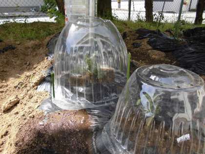 くきがおれたミニトマトは、べつのところからえだがのびてきているので、大じょうぶです。しっかり生きているのですね。スイカは「おおい」をしっかりとめました。