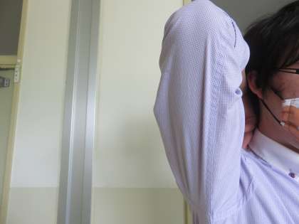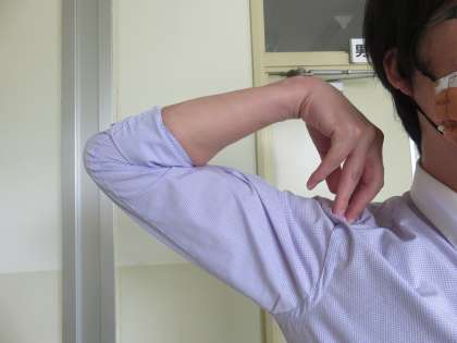 次に、2枚目の写真のように、ひじを前にもってきて、同じように上下に動かします。