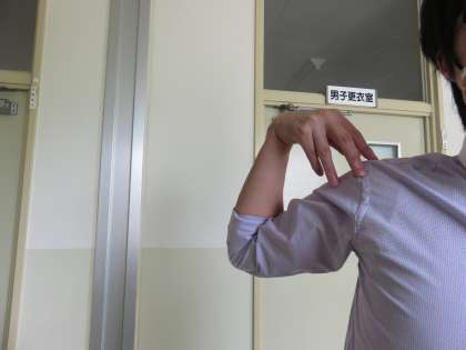 最後に、3枚目の写真のように、ひじを前にもってきているじょうたいから後ろにゆっくり回します。