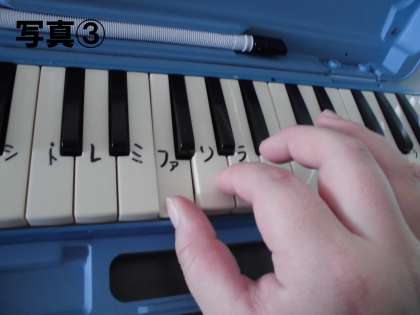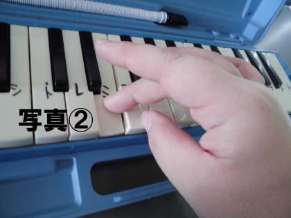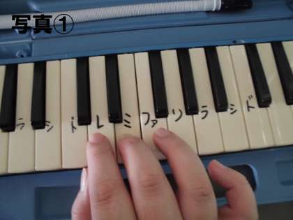 今日は、音楽です。けんばんハーモニカ練習を宿題にしました。「ゆびくぐり」は写真2のように、「ミ」をおしている中指の下に親指をくぐらせ、「ファ」を親指でひきます。その後は人差し指から順番に「ソラシド」とひいていきましょう。