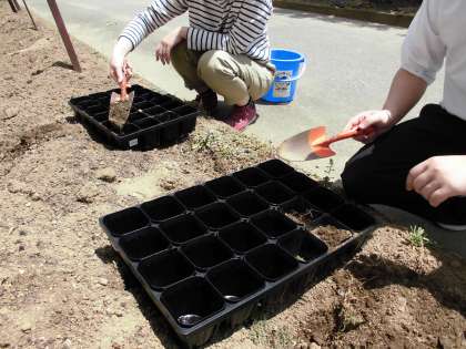 4年生のみなさん、こんにちは。先日、4年生の先生で協力して、ヘチマの種まきをしました。毎日、「元気に育ってね。大きくなあれ。」と願いをこめて、水やりをしています。