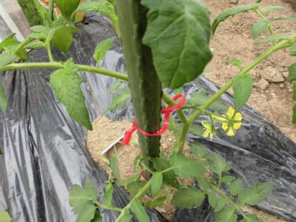トマト、ミニトマトのえだがのびてきて、2かしょ目のむすぶさぎょうをしました。えだがいくつかに分かれていますが、いちばん太いものを主枝(しゅし)にきめて、しちゅうにむすびます。むすぶときは、すこしよゆうをもって、数字の「8」のようにむすびます。ひもでもいいですが、ビニタイをつかうとねじるだけでできるので、べんりですよ。わきめもとって、すっきり風とおしをよくしておきましょう。