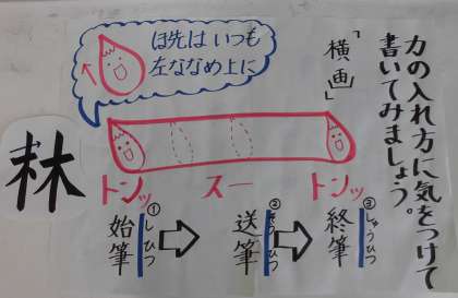 点画の種類(しゅるい)はいくつかありますが、今回は「横画」についてしょうかいします。トン・スー・トンのリズムを意しきして書いてみましょう。最初の課題にあった、「林」という字にも横画がありますね。左の「きへん」の横画は右上がりに書くとよいですよ。