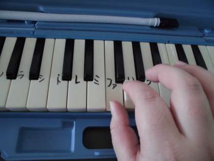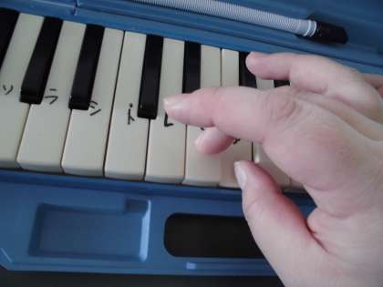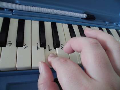 さて、今日は指またぎに挑戦です。高いドからドシラソファミレドと降りてくる練習にんります。ポイントはファからミの音を演奏するときに親指の上を中指がまたぐようにして演奏することです。写真を参考にたくさん練習してみてくださいね♪