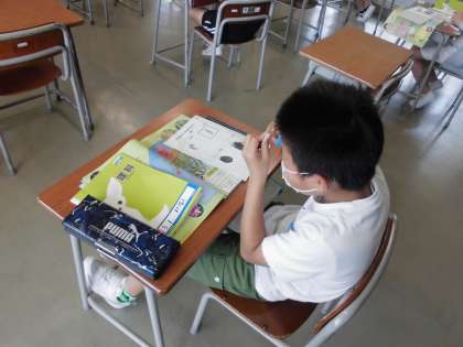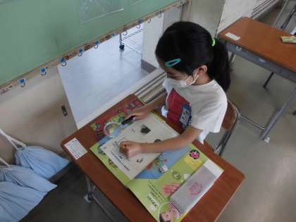 理科では種の観察を行っています。虫めがねを正しく使って、細かく種を観察する子供たち。種を植えて、植物の成長の様子を学習していきます。