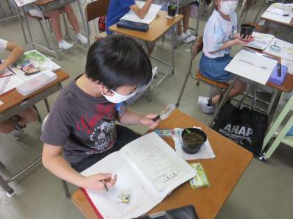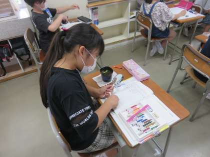 今日は、分散登校中に植えた植物から芽が出ていたので観察しました。小さな種から子葉に生長した様子をじっくり観察し、ていねいにノートにかいていました。