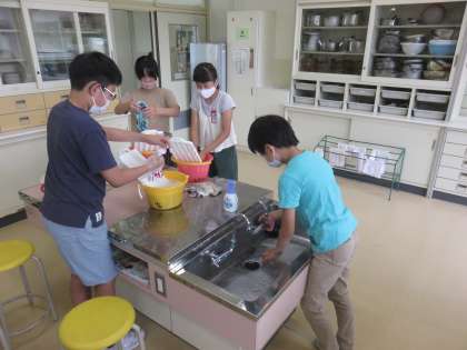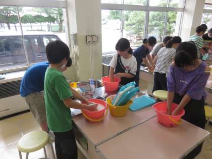 6年生では、家庭科の学習で洗濯実習をおこないました。普段着ている服や靴下等を手洗いで一生懸命に洗っていました。「砂の汚れが取れてきたよ」「次に使うときはいいにおいがして楽しみだ」等、自分の洗濯物の汚れが落ち、きれいになっていくことに喜びを感じながら学習に取り組んでいました。