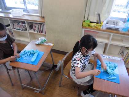 食べ物や生き物なと想像力を働かせながら楽しくつくりました。