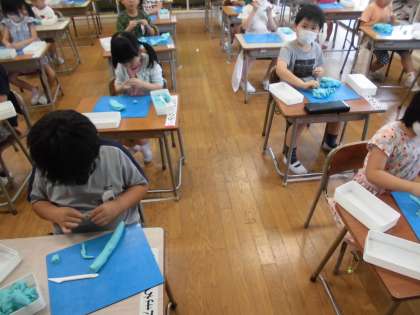 粘土を丸めたり、切ったり、のばしたり、つぶしたりしながら、いろいろなものを表現しています。