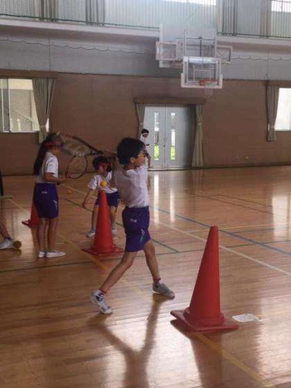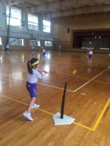 毎日、雨が続く天気ですが子供たちは元気よく過ごしています。体育の学習では「ラケットベースボール」が始まりました。バットの代わりにラケットを使い、野球のように攻守交代しゲームを進めます。今日は、ラケットの打ち方や守備の練習を行いました。女子も男子も思いっきりラケットを振り、とても楽しそうでした。