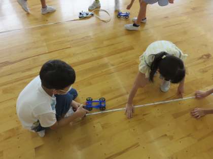 理科では、ゴムの物を動かすはたらきについて学習しています。ゴムの伸ばしかたで車を動かす力が変わるか実験中の子供たち。グループで協力しながら計測したり、分かったことをまとめたりしながら意欲的に活動していました。