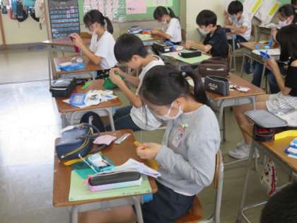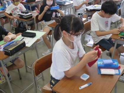 家庭科では裁縫を行っています。学習のまとめとしてティッシュケースをつくっています。丈夫にしたいという思いをもってなみ縫いではなく本返し縫いをしたり、オリジナルの物をつくりたいという思いから名前のイニシャルを縫ったりするなど、これまで学んだ技術を生かして心を込めてつくっています。