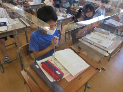 音楽では同じリズムや変化を使って、まとまりのあるリズムをつくる学習を行っています。三三七拍子を例に、子供たちは四分音符と八分音符を使って手拍子をしながらリズムづくりに取り組みました。オリジナルのリズムを楽しそうに何度も手拍子で叩いている姿が素敵です。
