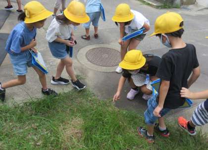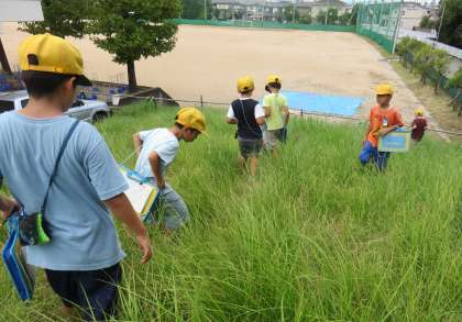 理科の学習では、昆虫などの動物の様子に学習しています。バッタやトンボ、だんごむし等はどこに住んでいるのか、なぜそこに住んでいるのかを調べに外に出ました。子供たちは草をかき分け、石を持ち上げ、虫たちを見つけて行きます。たくさんの虫に出会うことができて、嬉しそうでした。