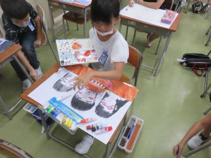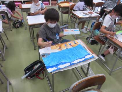図画工作科では「あの日あのときの気持ち」という学習を行っています。今までの生活で心に残ったことを絵で表します。色使いや表情等でその時の気持ちを表現しようと真剣に取り組んでいます。どのような絵ができるか楽しみです。