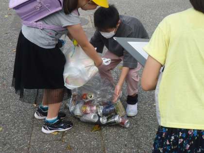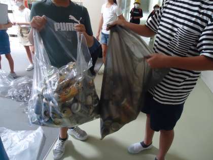 ボランティア委員会が募金活動としてアルミ缶回収を行いました。アルミ缶を受け取るときに「ありがとうございます」と声をかける委員会の子供たちの姿が印象的でした。