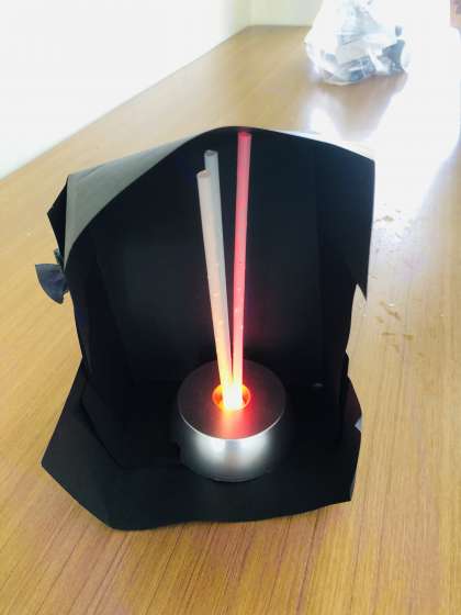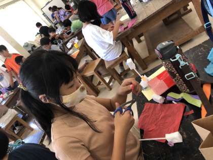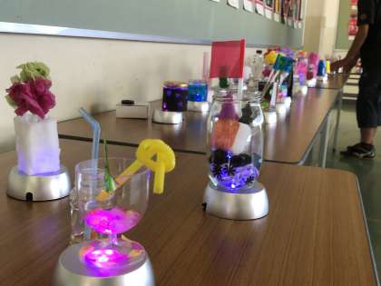 図工ではLEDライトを使った工作「光の形」を学習しました。作品の観賞会では「お花紙やスポンジ、透明のビンを組み合わせて明るく光るようにしたよ」「色水の中に赤色のビー玉を入れると、夕日のような光り方になった」「黒の画用紙で囲い、穴を開けたストローで光を集めたよ」など作品への思いを話していました。光の効果を考えた一人一人の豊かな発想にとても驚かされました。