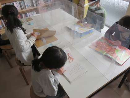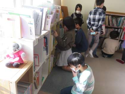 3年生の国語科では1年生に読み聞かせをする本を話し合って決める学習を行っています。話し合う前に、まずは自分の考えをもつために、図書室に行って自分が読み聞かせしたい本を選びました。今までの経験を思い起こして、どの本を読んであげようかワクワクしながら本を選んでいました。