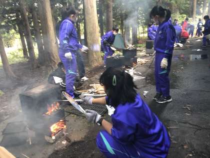 かまど担当の子供たちの様子です。次々とできあがったピザを缶かまどで焼いています。とっても真剣でした。