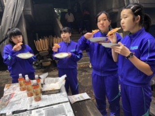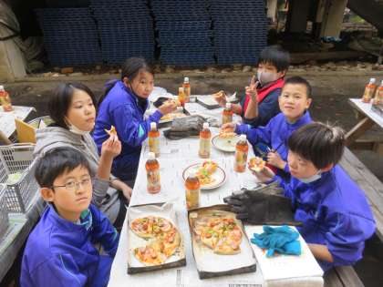 美味しいピザが出来上がりました。みんな笑顔です。