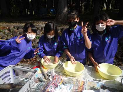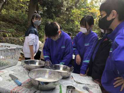 6年生は、国立立山青少年自然の家へ校外学習へ行きました。天気は快晴。紅葉が美しい自然の中で、ピザ作りとポイント探しをしました。写真はピザの生地を作っている様子です。手際よくみんなで協力して作っていました。とても楽しそうです。