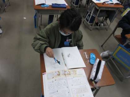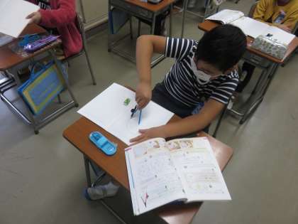 算数の学習では、コンパスを使って円をかく練習をしています.コンパスの使い方に四苦八苦しながら、きれいな円がかけると嬉しそうに喜んでいました。コンパスを使って、色々な図形が描けるよう、練習を重ねていきます!