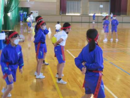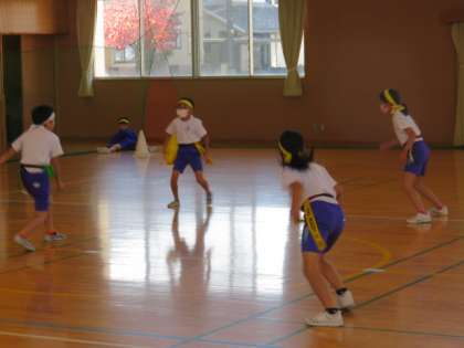 ボールを持っているのを相手に気付かれないように仲間と連携しながら攻めたり、相手にタッチダウンをされないように声を掛け合って協力して守ったりするなど、作戦を考えながら楽しんで活動しています。スポーツフェスティバルの時のような熱戦が繰り広げられています。