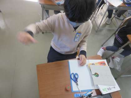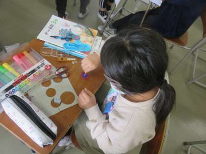 円の学習の最後に、コンパスを使って模様を描き、こまを作る活動に取り組みました。今まで学習したことを生かし、きれいな模様のこまを真剣に作っていました。自慢のこまを持ち帰ってきたら、ぜひおうちでも回してみてください。