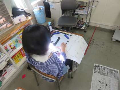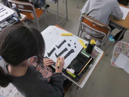 書写もだいぶ上達してきました。今日は、はねの練習です。真剣に筆を運んでいます。