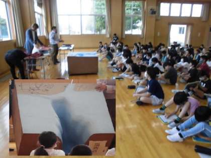 9月26日(木)岩瀬漁港の漁師さん3人に学校へ来ていただき、5年生が話を聞いたり模型を見せていただいたりしました。「岩瀬から10分ほど海を船で進むと、300mほどの深さになるんだって」「白エビがとれるといいね」富山湾の模型や実際の網を見せてもらい、前回の四方漁港との共通点や違いを学んだ5年生でした。