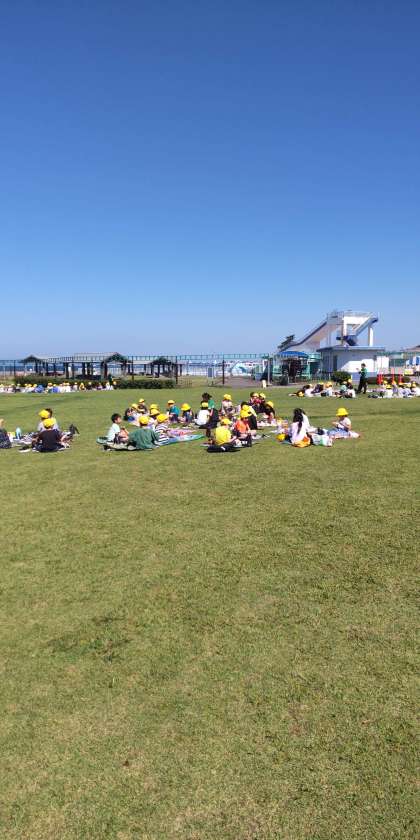 11時30分、少し早いですが、芝生広場でおいしく食べています。弁当ありがとう。