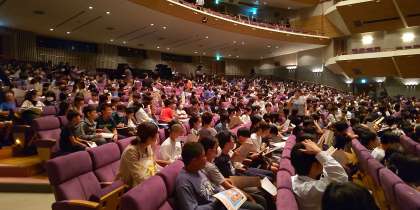オーバードホールで、観劇前、わくわくして待つ6年生。市内6年生半分1500名が集まっています。