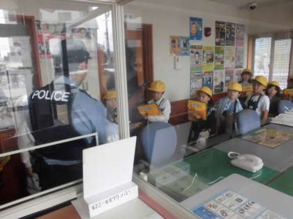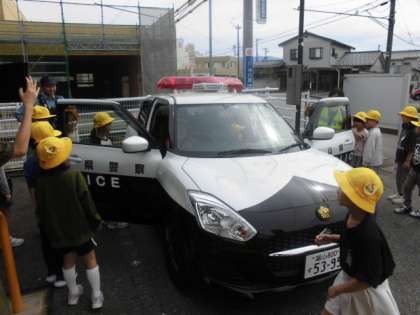 交番では、警察官の話を聞いたり、持ち物を見せてもらったり、パトカーに乗せてもらったりしました。また、店に入らせていただいて、焼きたてのパン、できたてのチャーシューがおいしそうでしたね。地域には、いつもお世話になっている店や施設、人々がいらっしゃることを知りました。付き添ってくださった保護者の皆様、ありがとうございました。