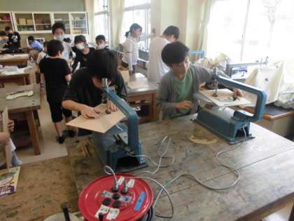 5年生が図画工作科で、電動糸のこぎりを使って板を切っています。少し曲げたり小さく切ったりして、作品づくりを楽しんでいます。