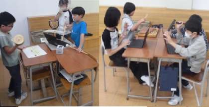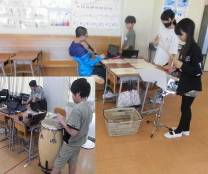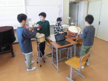 5年生が音楽で、いろいろな打楽器を使って、グループごとにアンサンブルをつくっています。リズムを合わせて、祭りなどのテーマを考えて創作しています。