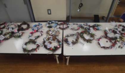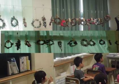 1年生が、集めたドングリや松ぼっくり、つるなどを使って作った「リース」が、教室や廊下に飾られています。まだクリスマスには早いですが、秋らしい作品に仕上がっています。